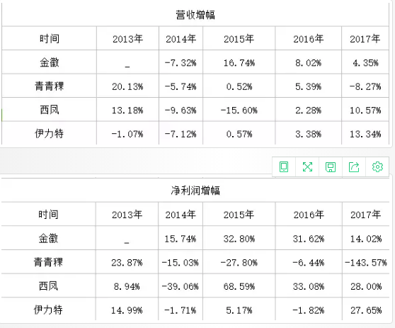 从营收与净利润数值上来看,作为老八大名酒,品牌背书强大的西凤占有优势,而最不容乐观的则是唯一一家在2017年呈现亏损状态的青青稞。