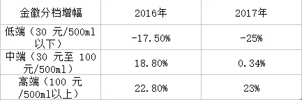 金徽酒目前恰恰是高端产品的增长表现亮眼。2017年营收方面,金徽延续了2016年的态势:低档产品同比下降约25%;中档(世纪金徽三星、世纪金徽四星等)同步上升约0.34%;高档(金徽十八年、世纪金徽五星、柔和金徽等)同步上升约23%。金徽酒以甘肃为中心,逐渐覆盖西北。面向百元以上价位消费群体,重点推广金徽十八年、世纪金徽五星、柔和金徽系列、金徽正能量系列等产品,并树立了柔和金徽系列高档产品的品牌形象。抓住新一轮消费升级机遇发展高档系列的金徽,正在不断发力高端白酒消费市场。