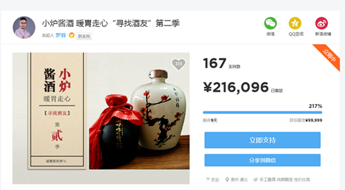 当前,随着营销模式的多元化,众筹成为一种受关注度很高的营销方式。日前,一款名为小炉作坊的酱酒就在众筹网上开启了第二季众筹,短短7个小时便实现了众筹目标,并且得到了投资圈大佬董宝珍的力挺。小炉酱酒作为一个新兴品牌,在知名度不高、品牌溢价能力不强的背景下,为何得到酒友和投资人的追捧呢?