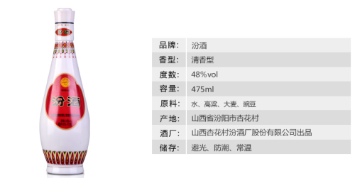 汾酒酿造是选用晋中平原的“一把抓高粱”为原料,用大麦、豌豆制成的糖化发酵剂,采用“清蒸二次清”的独特酿造工艺。黄盖玻汾,酒液莹澈透明,清香馥郁,入口香绵、甜润、醇厚、爽洌。