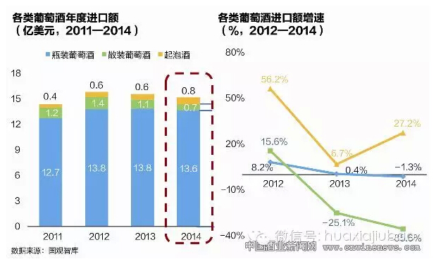 在进口葡萄酒中,瓶装酒以其75.1%的进口量蝉联进口冠军。较2013年,瓶装酒进口量增长3.24%,进口额下滑1.3%,均价下滑4.4%。