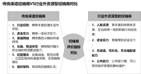 中小企业白酒品牌一般不要选择快消品行业经销商,如果非要选,第一选择:加多宝、红牛的经销商(该类客户有酒店渠道和商超渠道)第二选择:高端啤酒经销商(此类客户拥有高端消费群体的团购资源)